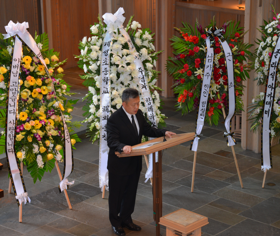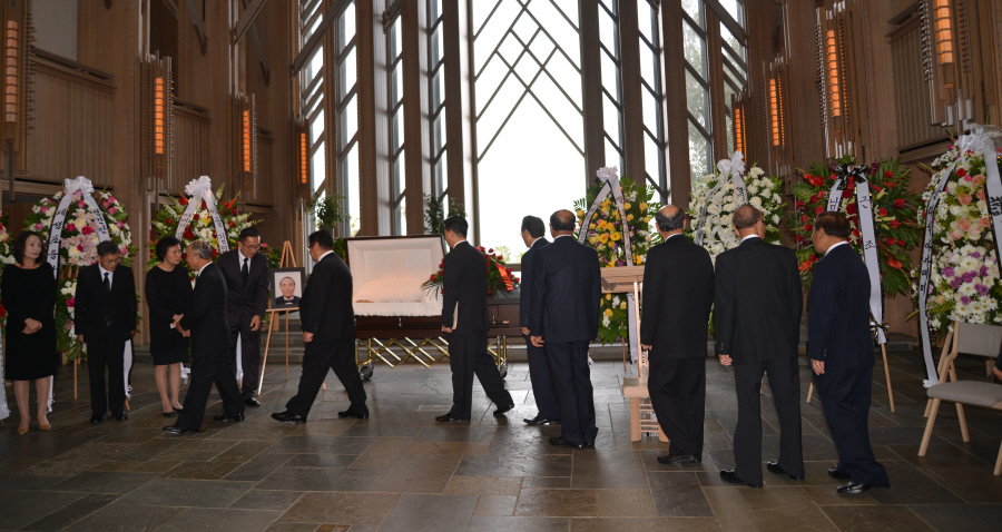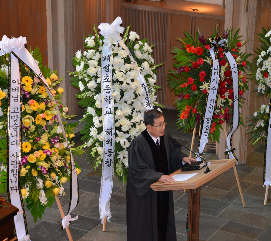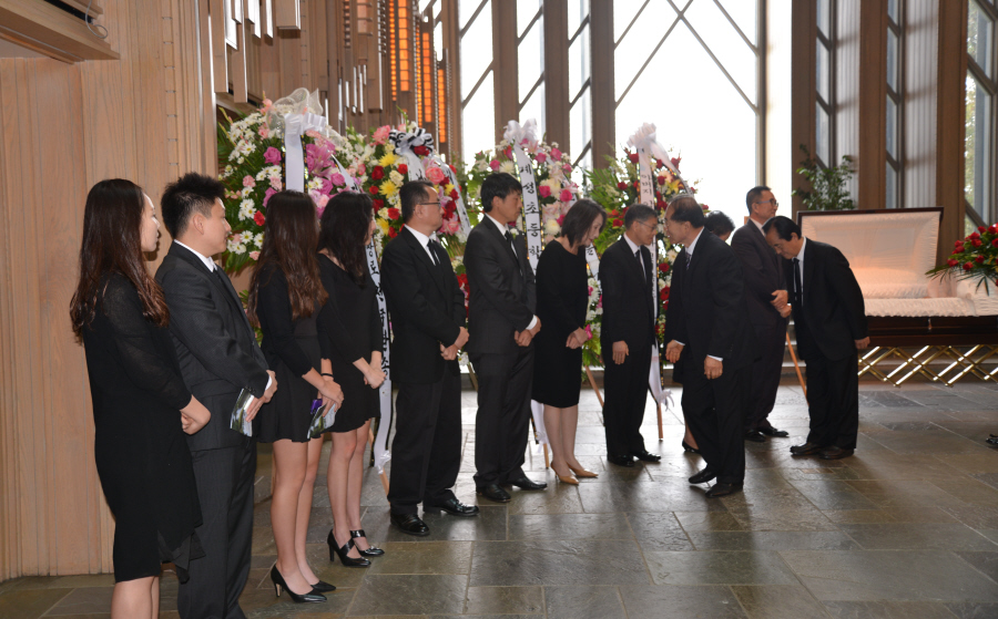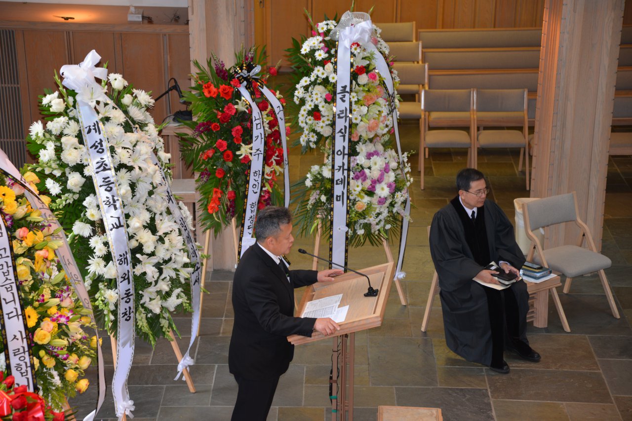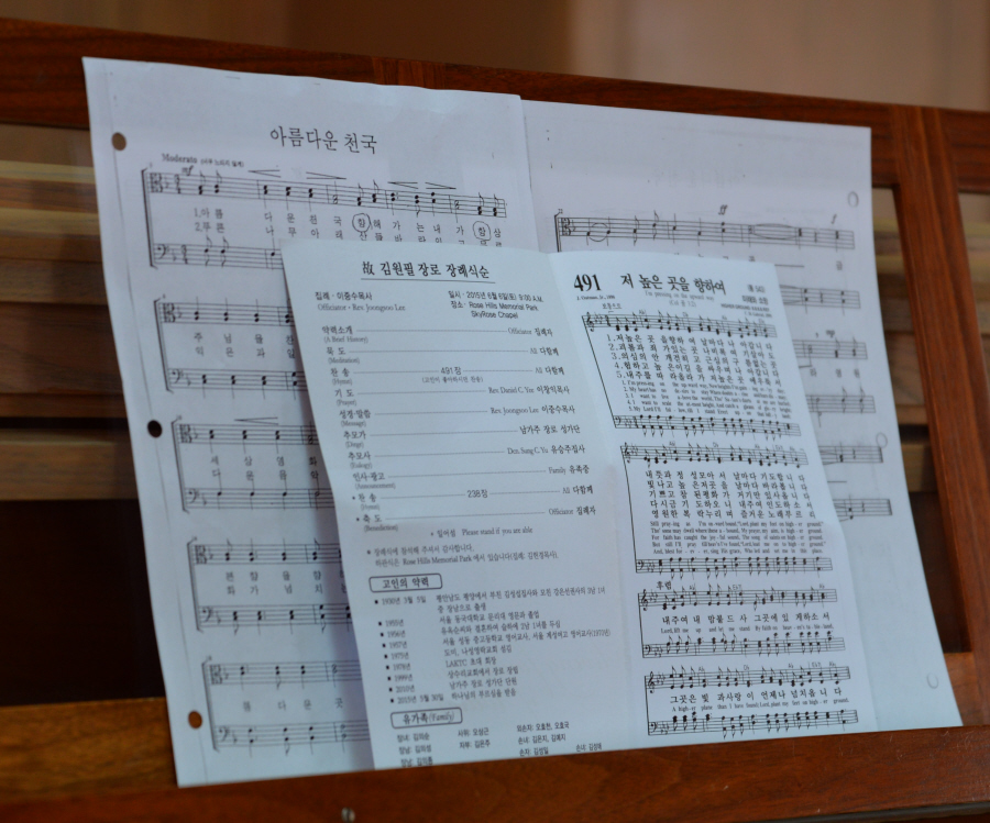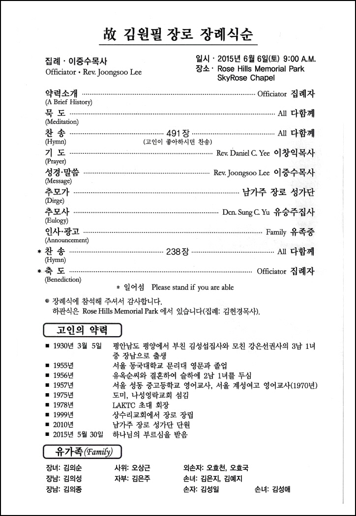 일의 연세로 하나님의 부르심을 받아 이땅 에서의 삶을 끝내고 하나님아버지께서 계시는 영원한 나라 천국에 입성 하셨습니다.우리는 이날 2015년 6월6일 토요일 오전 9 시에 영혼이 이미 하늘나라로 가신 장로님을 이땅에서의 마지막 모습을 보며 하나님께 찬양자로서 삶을 살으셨던 장로님을 하나님께 찬양으로 환송예배를 올려드리기위해 평소 사랑하고 아끼시던 남가주장로성가단 단원들이 Rose Hills Memorial Park SkyRose Chapel에 모였습니다.