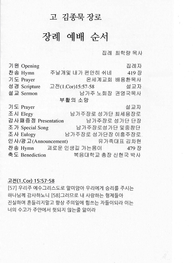 평소 제가 사랑하던 "고" 김종묵 장로님이 우리와 가까히하며 하나님을 찬양하던때의 인자한 모습입니다.언제나 다정하시고 다감하시며 조용하시어 옆에 계시는지 어떤때는 잠시 착각할때도 있곤 했던 장로님을 다시 생각해보며 이것이 꿈이 아닌가 혼동에 빠지기도합니다.