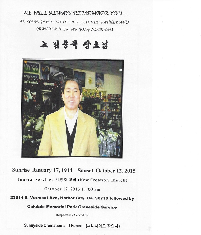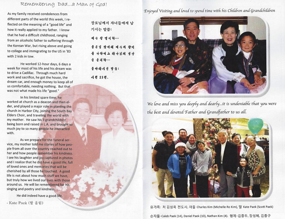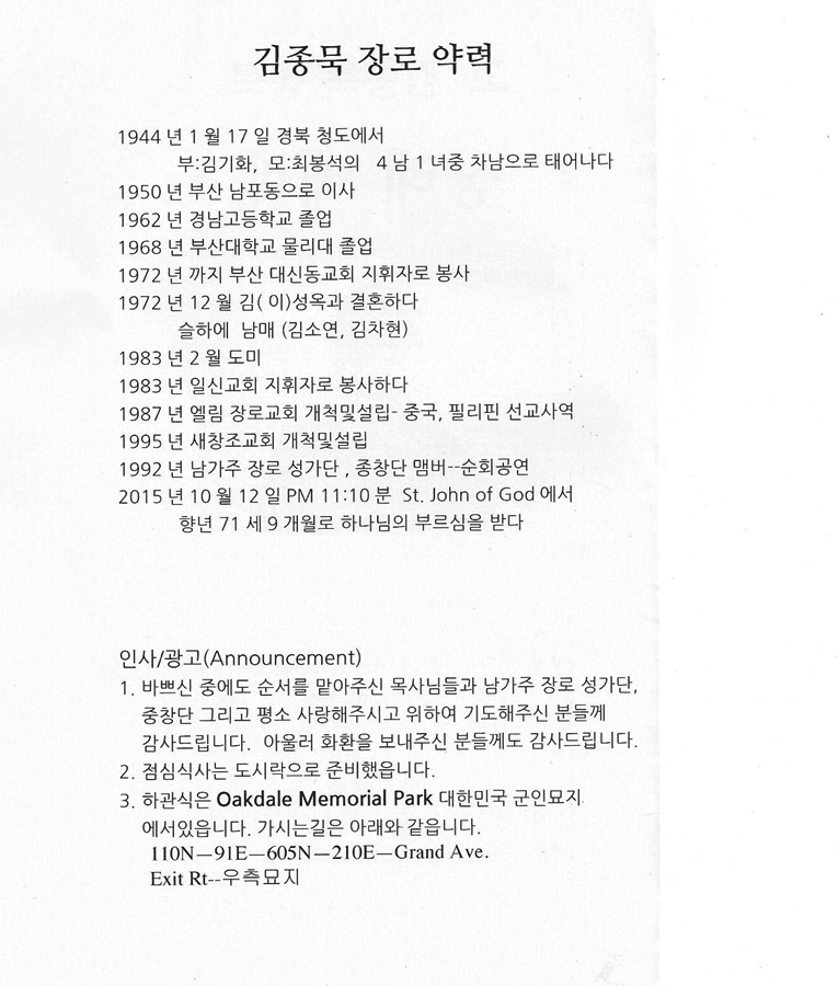 장로님께서는 일제 말기 우리나라가 해방되기전 어렵고 힘들때 1944년 1 월 17일 이땅에 하나님의 은총으로 이땅에 태어나시어 하나님께서 맛겨주신 사역을 충성스럽게 감당하시고 달려갈길 다달려 마침내 2015년 10월 12일 다시 부르심을받고 아버지 품으로 돌아가셨으며 영광스럽게 천국문을열고 아버지 나라에 入城하셨습니다 할랠루야 !!!!