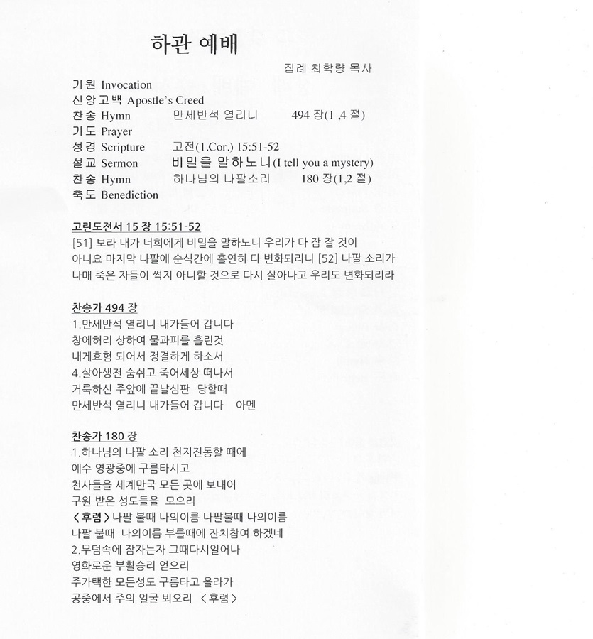 장로님 장로님의 따듯한 그 체온을 지금도 느끼며 장로님께서 사랑하시던 이세상에서의 모든것을 놓으시고 마지막 가시는 모습을 저는 사진으로 담고 글로 써서 이곳 귀한 자리에 올리게 됨을 영광스럽게 생각하며 장로님과 같은 훌륭한분과 함께 했다는것을 하나님께 감사드립니다.